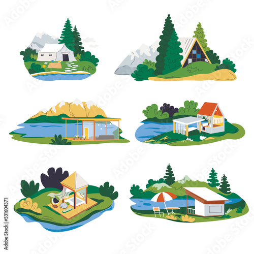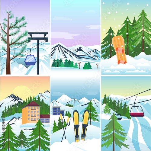 Векторный набор зимних забавных интерьерных плакатов, баннеров. Горнолыжный курорт с кафе, лыжным спуском, кресельным подъемником и канатным буксиром, ндс. Элементы дизайна в плоском стиле.