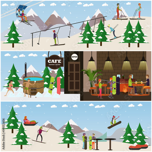 Векторный набор зимних веселых плакатов, баннеров. Люди, наслаждающиеся сноубордом, тюбингом, катанием на лыжах, ват, горным кафе. Элементы дизайна в плоском стиле горнолыжного курорта.