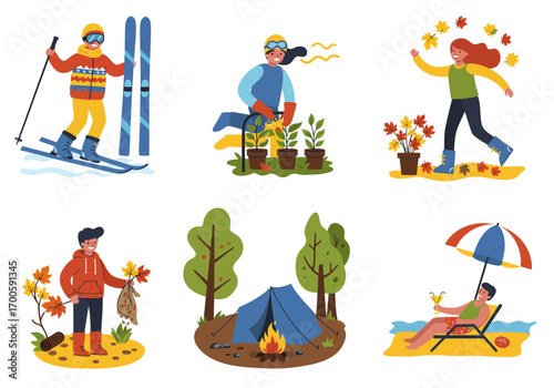 Векторный набор плакатов с зимними праздниками. Трамплин, канатный буксир, кресельный подъемник и элементы дизайна кафе в плоском стиле.