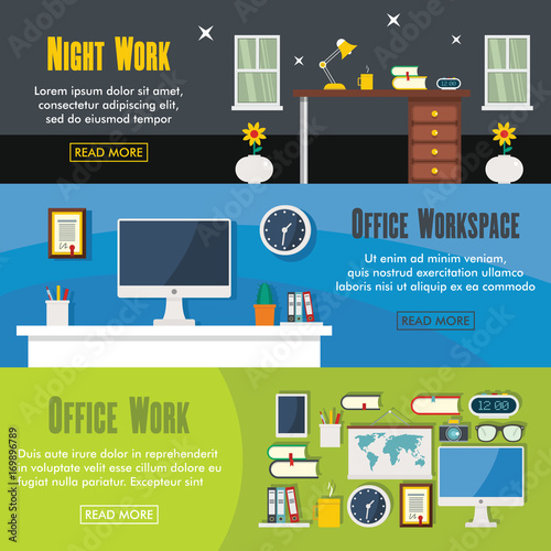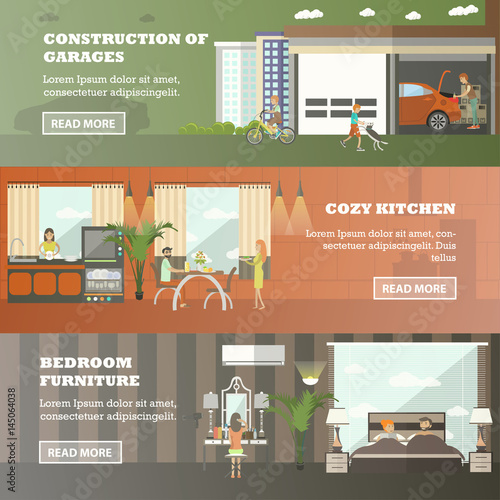 Векторный набор рабочих горизонтальных баннеров. Общественные работы, Доставка мебели и Ремонт на кухне с элементами дизайна в стиле квартиры.