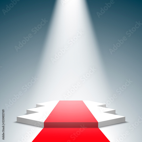 Белый круглый подиум сцены с красной ковровой дорожкой, освещенный напольными прожекторами. Векторная реалистичная иллюстрация. Фон прожектора подиума.