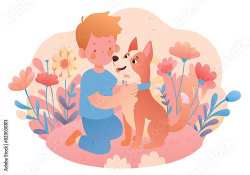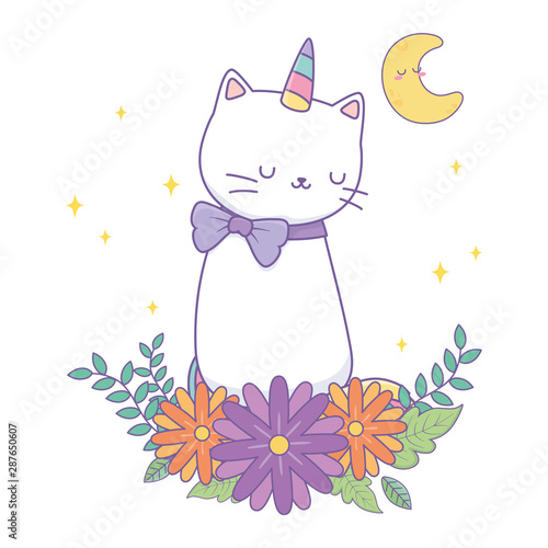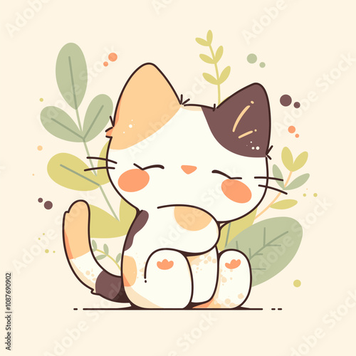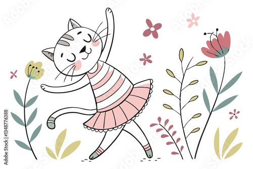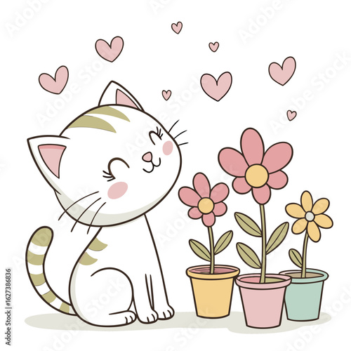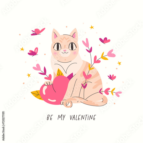 Милая векторная весенняя кошка с букетом полевых цветов в руках. Мультяшная иллюстрация забавного котенка-животного для дизайна поздравительной открытки. Счастливая кошечка с весенним приглашением, выделенным на белом фоне