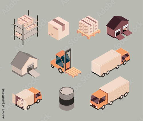 Векторный набор изометрических значков уличного грузовика с едой и тележки. Мобильные магазины быстрого питания для фестивалей уличной еды.