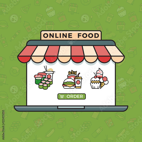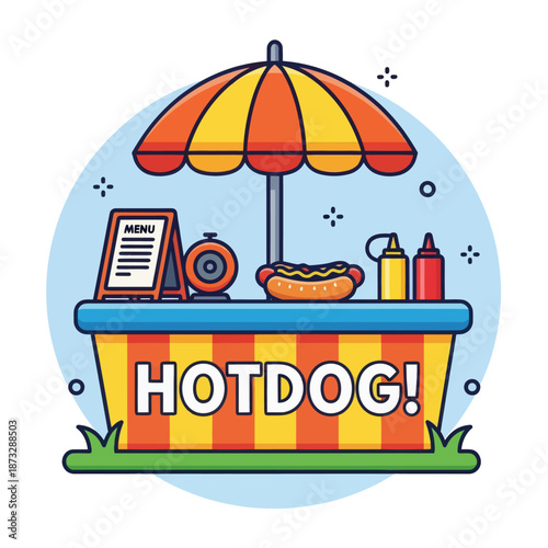 Векторный уличный рынок с иллюстрацией ассортимента закусок с пончиками и сладких напитков. Местный магазин быстрого питания, предлагающий лимонад, соки и десерты навынос. Концепция малого бизнеса
