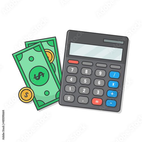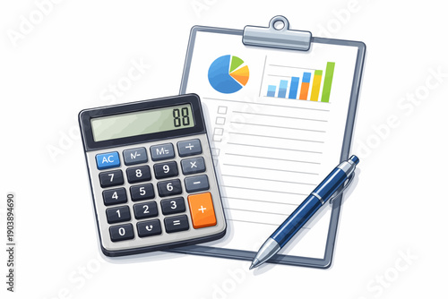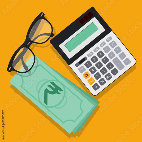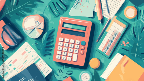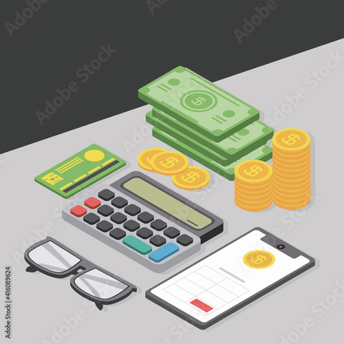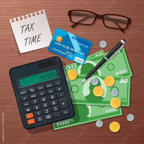 Векторный элемент дизайна концепции налогового времени, реалистичный деревянный фон. Бланк налоговой формы, пластиковая банковская карта, калькулятор, бумажные деньги, монеты, очки и ручка. Иллюстрация в плоском стиле.