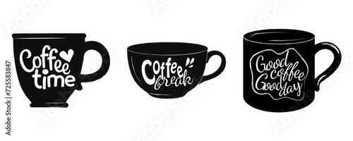 Векторный чайный сервиз с написанными от руки вдохновляющими и забавными чайными цитатами и высказываниями. Винтажный креативный типографский дизайн белого цвета на классной доске для чайной комнаты и печати.