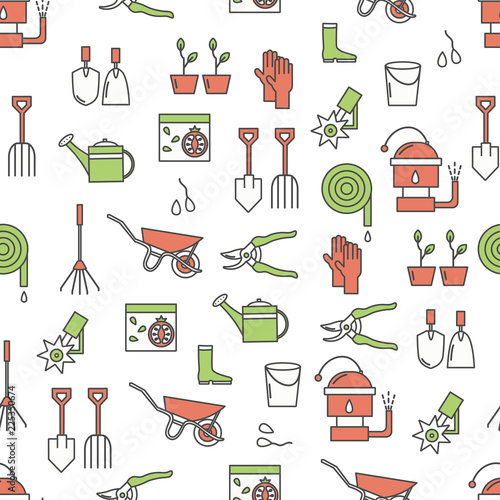 Векторный бесшовный узор с садовыми инструментами, оборудованием и одеждой. Тонкая линия искусства плоский стиль дизайна садоводства фон, обои.