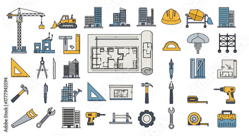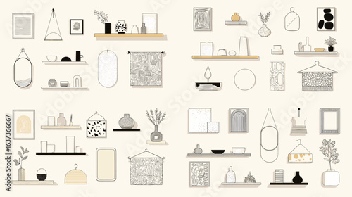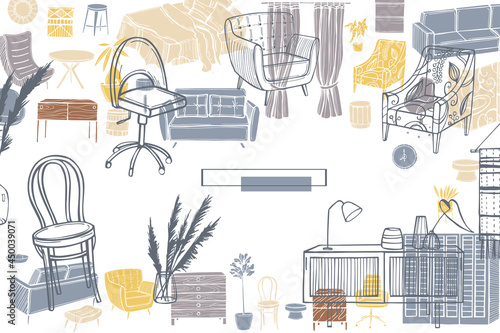 Шаблон баннера рекламного плаката жилья. Интерьер дома с мебелью, гаражом, автомобилем, велосипедом, векторная тонкая линия, элементы дизайна в плоском стиле, иконки для веб-баннеров и печатных материалов.