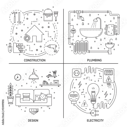 Шаблон баннера производственного плаката. Производство тяжелой промышленности, электростанции, добыча ископаемого топлива векторная тонкая линия, элементы дизайна в плоском стиле, иконки для веб-баннеров и печатных материалов.