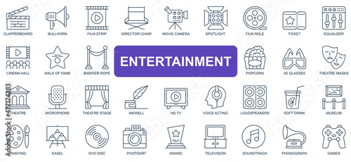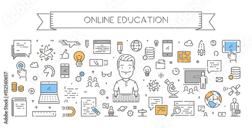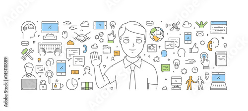 Шаблон баннера рекламного плаката в социальных сетях. Социальные сети, онлайн-чат, символы для общения по электронной почте. Векторные элементы дизайна в плоском стиле с тонкой линией, иконки для баннеров веб-сайта, печатные материалы