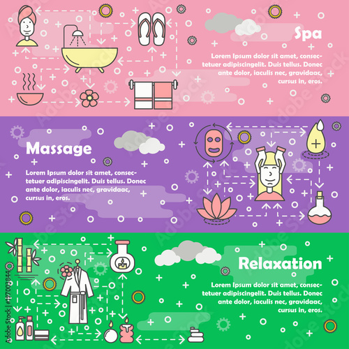 Набор шаблонов векторных веб-баннеров для сна. Спальная кровать, маска, подушка, таблетки, книга, чай, молоко, печенье, будильник, овца, речевой пузырь zzz и т.д. Сон и бессонница тонкие линии искусства плоские иконки.