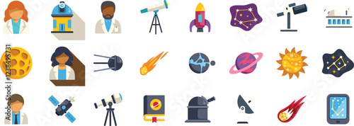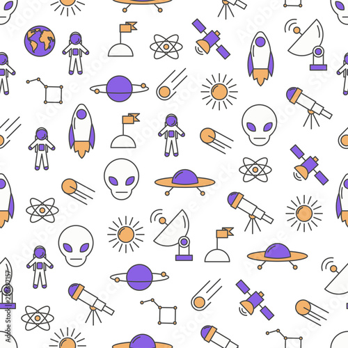 Векторный бесшовный узор с космическими объектами ракета, планеты, космический корабль, телескоп, астронавт, инопланетянин, созвездие и т.д. Тонкая линия искусства плоский стиль дизайна космос фон, обои.