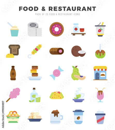 Набор иконок продуктов питания и кухонных принадлежностей. Векторные элементы дизайна в плоском стиле с тонкой линией, изолированные на белом фоне.