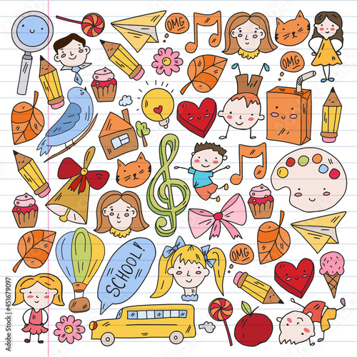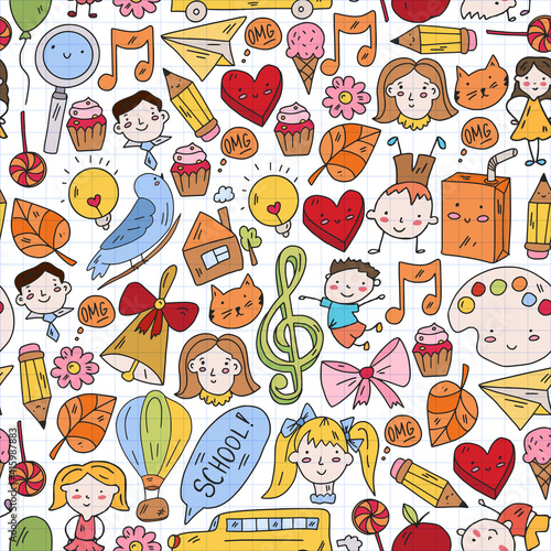 Векторный бесшовный узор с медведем, слоном, зеброй, попугаем, львом, рожком мороженого, автобусом, камерой, посетителями, кормом для животных и сахарной ватой. Тонкая линия искусства плоский стиль дизайна зоопарк фон, обои.