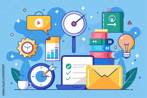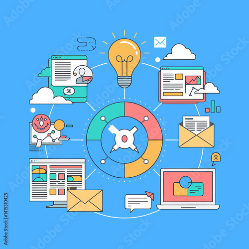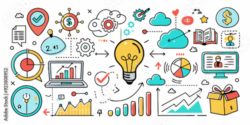 Шаблон баннера плаката мозгового штурма. Векторный дизайн в плоском стиле с тонкими линиями с офисными работниками, забавными персонажами мультфильмов, бизнес-символами, значками для баннеров веб-сайта и печатных материалов.