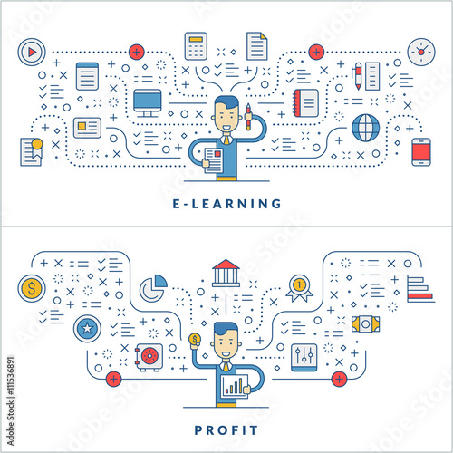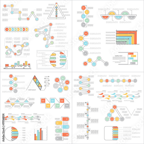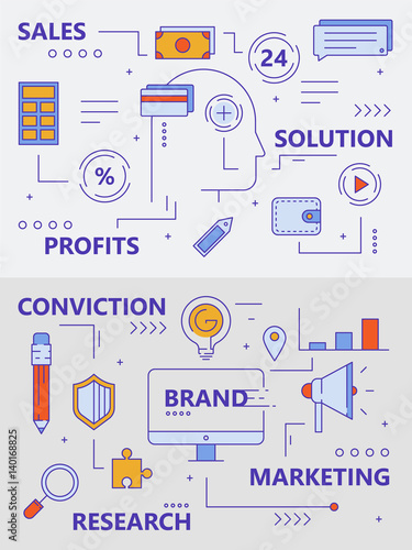 Векторный набор баннеров для продаж и бизнес-концепций. Линейные схемы бизнес-процессов и процессов продаж с 4 шагами. Тонкие линии плоского дизайна инфографических элементов и значков для Интернета, маркетинга и печати.