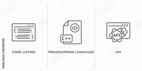 Векторный набор вертикальных баннеров с вебом, креативной идеей, программным обеспечением, оптимизацией сайта, элементами концепции кода. Тонкая линия плоских символов дизайна, иконки для меню сайта, печать.