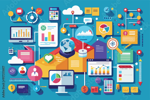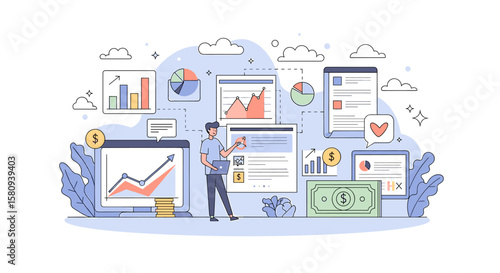 Шаблон баннера плаката социальной сети. Векторный дизайн в плоском стиле с тонкими линиями с забавными персонажами мультфильмов, социальными сетями, символами связи, значками для баннеров веб-сайтов и печатных материалов.