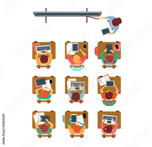 Векторная иллюстрация концепции школы с видом сверху. Учитель и школьники на уроке в классе. Дизайн в плоском стиле.
