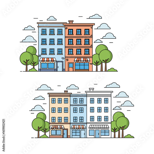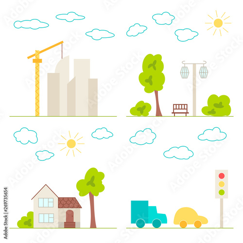 Векторный туристический интерьерный плакат, набор баннеров с городской улицей, стоянка такси, киоск уличной еды, кемпинг, сувенирный магазин. Дизайн в плоском стиле.