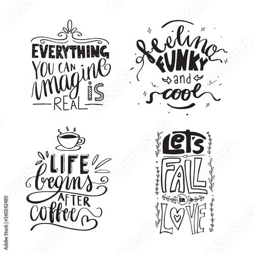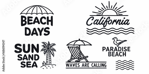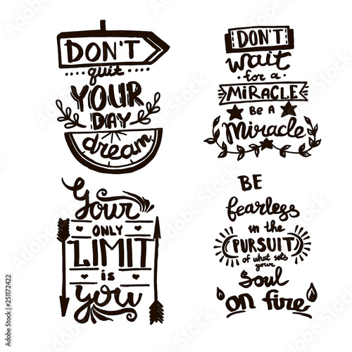 Векторный набор для рисования от руки с лодкой, воздушным шаром, пальмой на острове, чемоданом, глобусом с каллиграфическими цитатами, написанными от руки, фразами о путешествиях, летнее время. Винтажный креативный типографский дизайн.