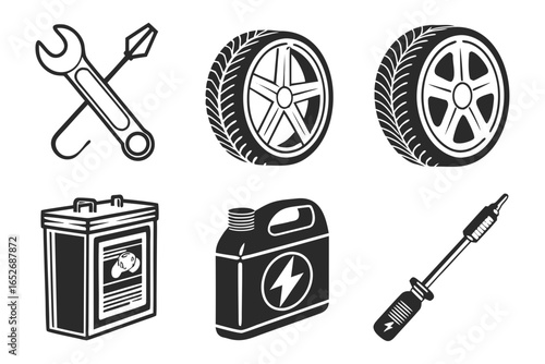 Векторный набор старинных символов автосервиса, иконки, изолированные на белом фоне. Черные шаблоны для логотипов и печати.