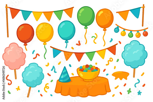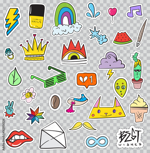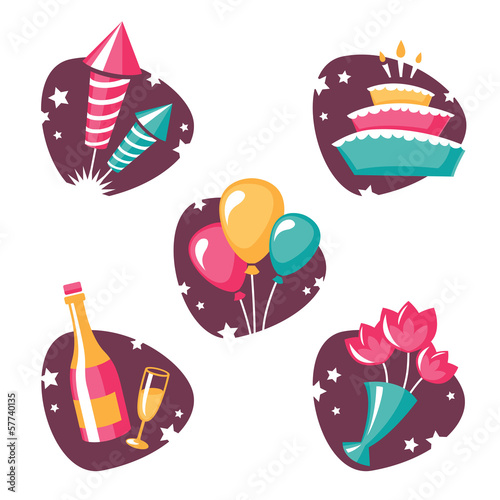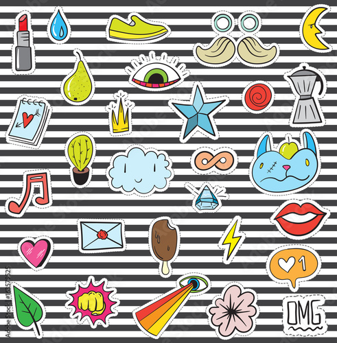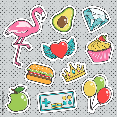 Векторные винтажные патчи поп-арта, набор наклеек с кусочком торта со свечой, бантом, воздушными шарами, конфетами, клубникой, улыбающейся звездой, конвертом, крыльями, сердечками. Значки для празднования дня рождения девочек.