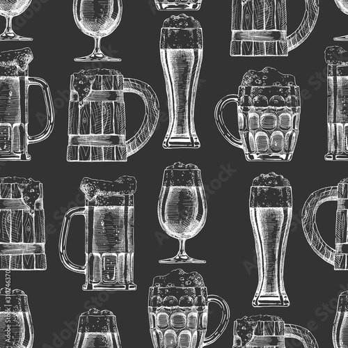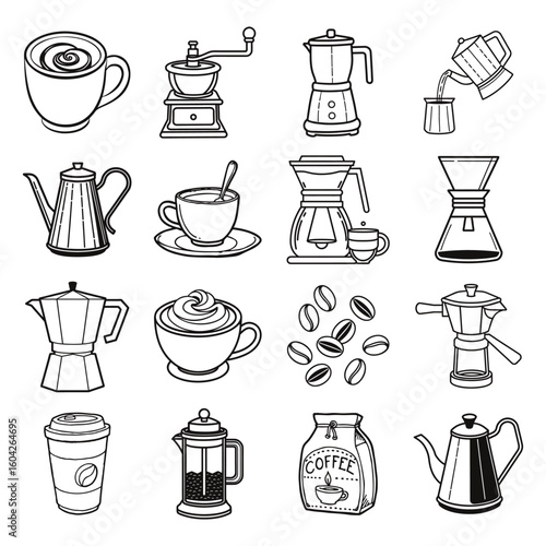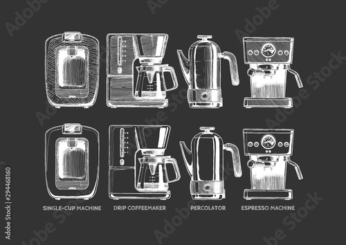 Кофейный сервиз, векторная рисованная иллюстрация. Винтажная белая кофейная кружка, чашка, кофейник и кофеварка на черном фоне для меню ресторана или кафе, плаката, баннера.