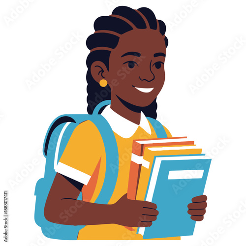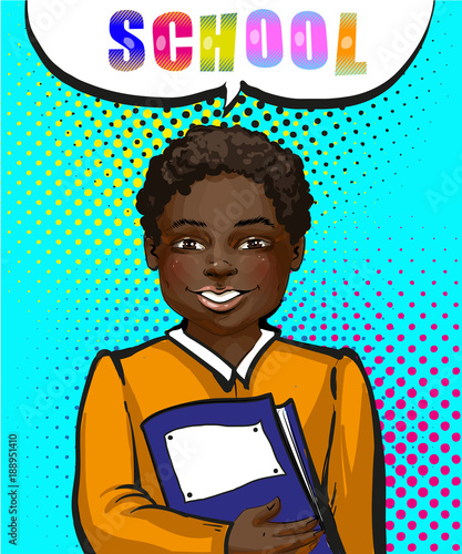 Векторный поп-арт афроамериканский школьник, держащий тетрадь. Иллюстрация в стиле винтажного комикса.