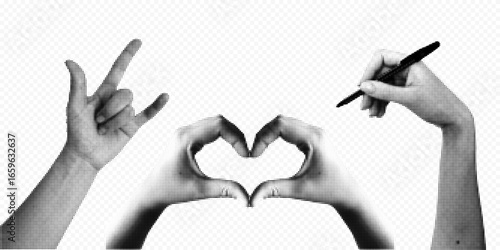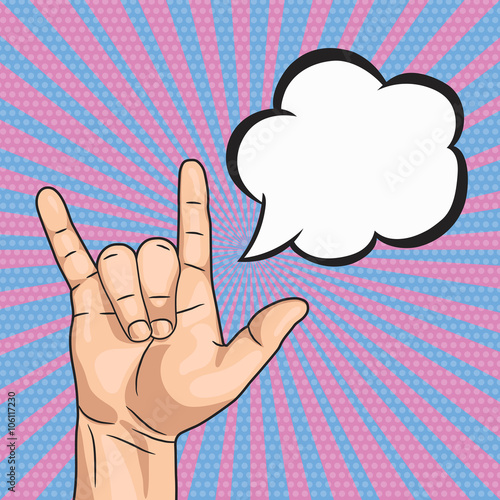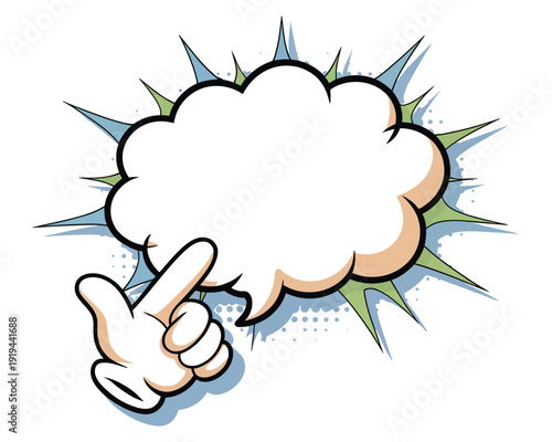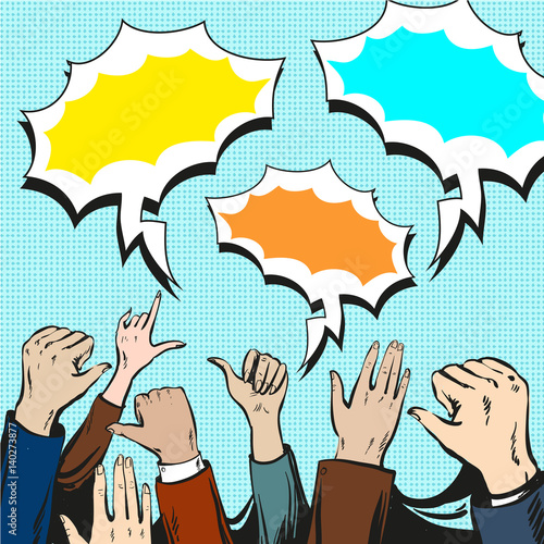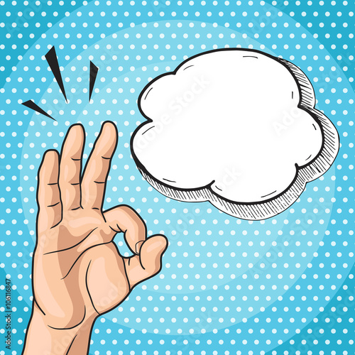 Векторный набор знаков винтажного поп-арта с комиксами. Знак "Ок", большой палец вверх, большой палец вниз, указательный палец, поднятая рука, пузыри речи.