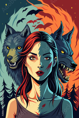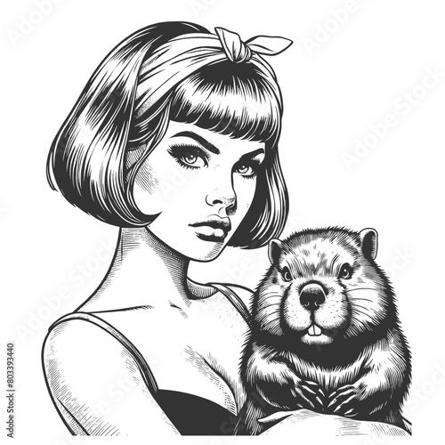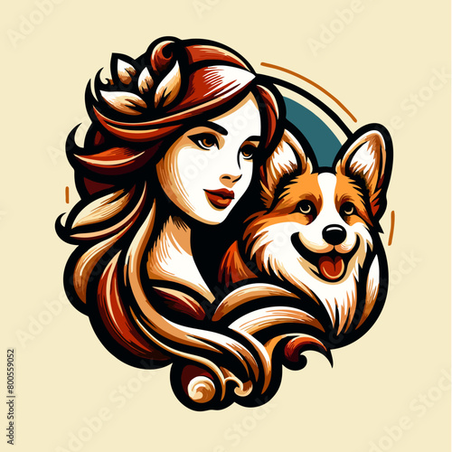 Векторное поп-искусство красивая девушка со своей любимой собакой померанским шпицем, речевой пузырь. Иллюстрация в стиле старинных комиксов.