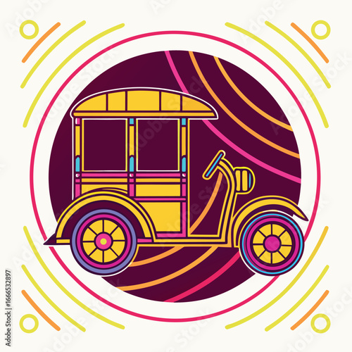 Векторный винтажный плакат о путешествиях. Иллюстрация туристического автобуса и велосипеда, стоящего на нем в стиле комиксов ретро-поп-арта.