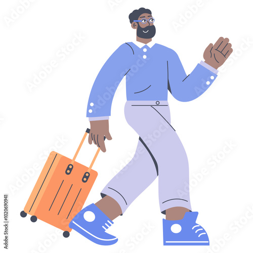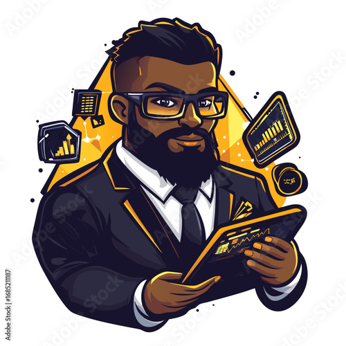 Векторная иллюстрация идущего бизнесмена, думающего о кредитной карте. Мужчина с портфелем, полным денег, долларовые купюры летают вокруг него в стиле комиксов ретро-поп-арта.