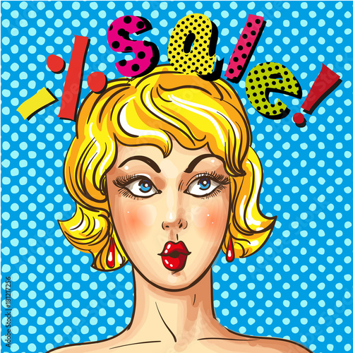 Векторная иллюстрация удивленной блондинки и надписи о продаже. Рекламный плакат со скидками и распродажами в стиле ретро-поп-арт-комиксов.