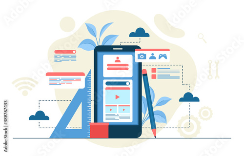 Векторный шаблон дизайна веб-сайта. Женская команда создает мобильное приложение и веб-сайт. Концепции целевых страниц для мобильной разработки. Современная плоская иллюстрация.