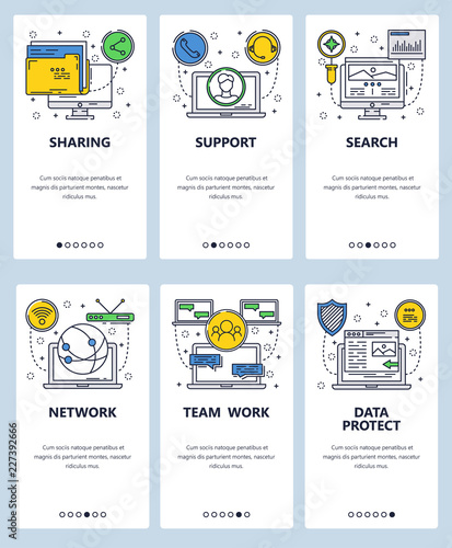 Векторный веб-сайт linear art onboarding screens template. Компьютерные и почтовые службы, прикрепление, архивирование, копирование и удаление файлов. Баннеры меню для разработки веб-сайтов и мобильных приложений.