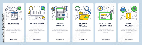 Шаблон экранов для векторного веб-сайта с линейным искусством. Бизнес-стратегия и решения. Баннеры меню для разработки веб-сайтов и мобильных приложений. Плоская иллюстрация современного дизайна
