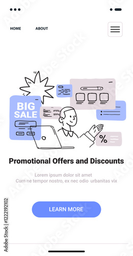 Шаблон экранов для векторного веб-сайта с линейным искусством. Цифровой маркетинг и реклама. PR, бренд-менеджмент и мобильный маркетинг. Баннеры меню для разработки веб-сайтов и мобильных приложений. Плоская иллюстрация современного дизайна