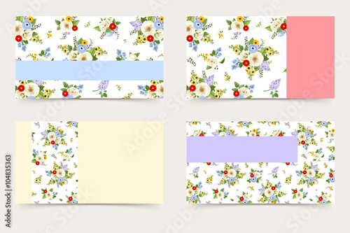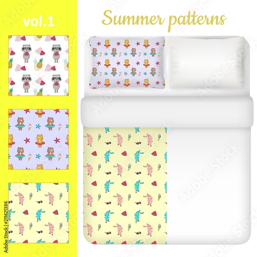 Белая заготовка и комплект летнего постельного белья. Три бесшовных узора для образцов ткани детского постельного белья с милым мультяшным кроликом, енотом, медведем, мороженым, ананасом, арбузом. Векторная иллюстрация с видом сверху.