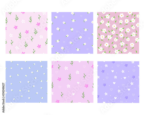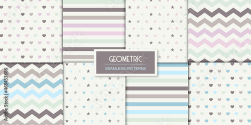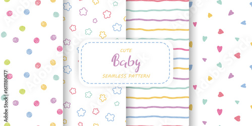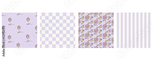 Комплект постельного белья с белой простыней и единорогом. Три бесшовных узора для образцов ткани детского постельного белья с волшебными единорогами, радугами, облаками, сердечками. Векторная иллюстрация с видом сверху.