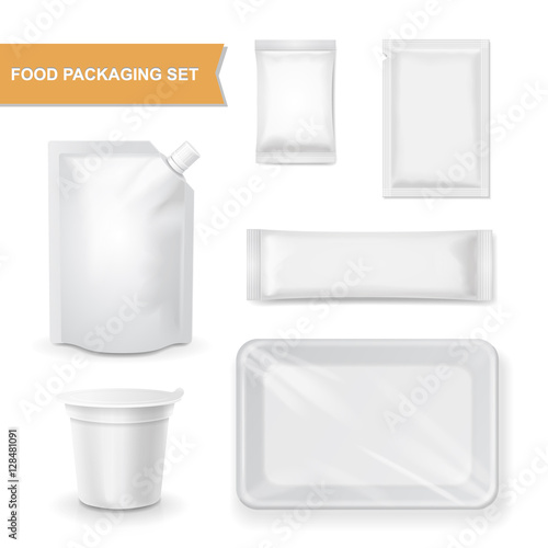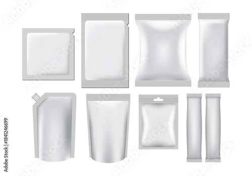 Векторный набор упаковок из белой пустой фольги. Макеты шаблонов пластиковых пакетов.