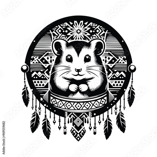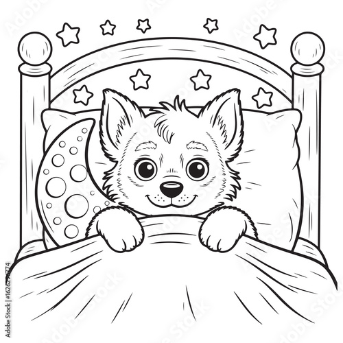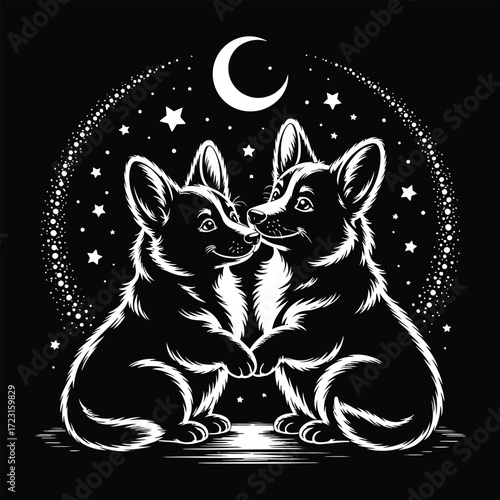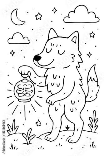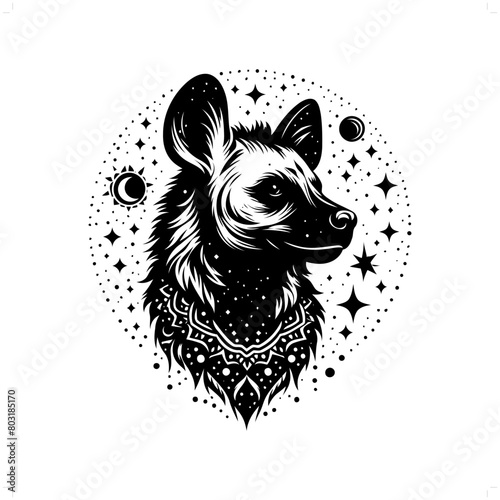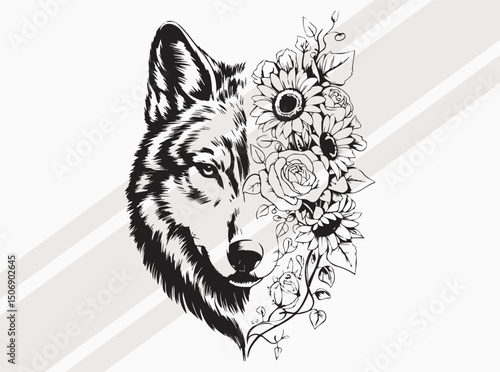 Векторная татуировка животного или дизайн принта на футболке. Голова волка в сочетании с природой в круглой рамке с фазами луны.