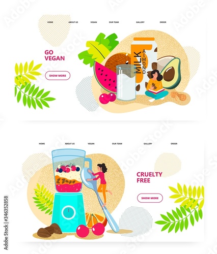 Веганская еда и ягодный коктейль. Миндальное молоко, фрукты, блендер, еда без жестокости. Иллюстрация концепции. Векторный шаблон дизайна веб-сайта. Иллюстрация сайта целевой страницы.
