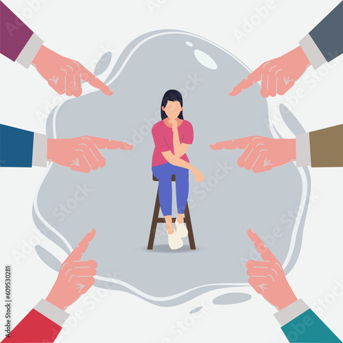 Векторная иллюстрация веганского социального давления и дискриминации. Общество подвергает молодого человека травле и пристыжает его, указывая на него руками, из-за неприятия