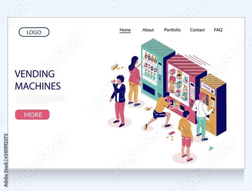 Векторный шаблон веб-сайта торговых автоматов, дизайн целевой страницы для разработки веб-сайтов и мобильных сайтов. Набор изометрических автоматических торговых автоматов и персонажи, покупающие кофе, закуски и безалкогольные напитки.