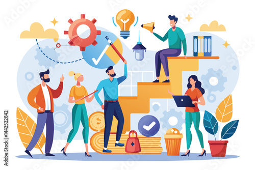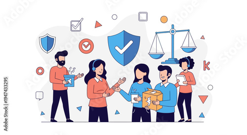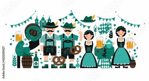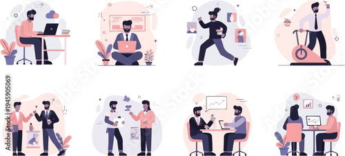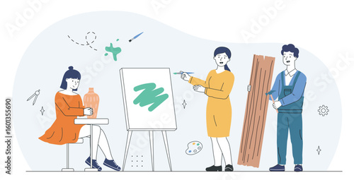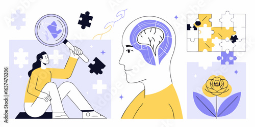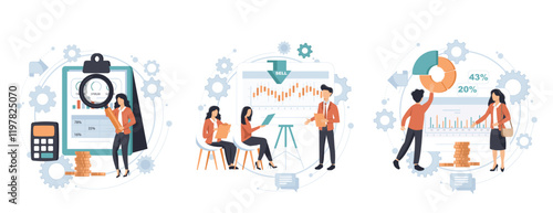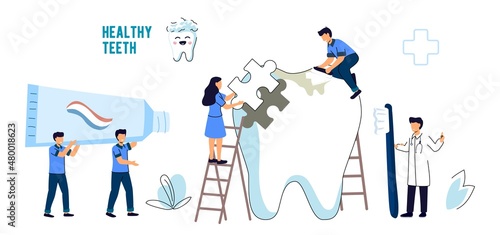 Услуги ветеринарной клиники, векторная плоская иллюстрация. Огромные собака и кошка, крошечные персонажи-ветеринары со шприцем, микроскопом, увеличительным стеклом. Осмотр домашних животных ветеринаром, лечение животных, медицинский уход за домашними животными.