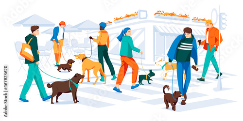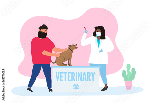 Огромная собака, микро самец, женские персонажи в ветеринарной клинике, векторная иллюстрация. Врач-ветеринар гладит щенка, женщина дает сухой корм, мужчина держит сердце. Любовь и доброта к животным, забота о здоровье собак.