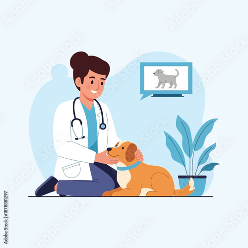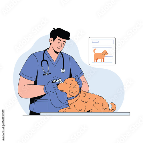 Врач ветеринарной клиники осматривает и лечит собаку векторным значком на изолированном фоне.