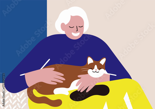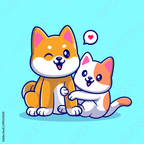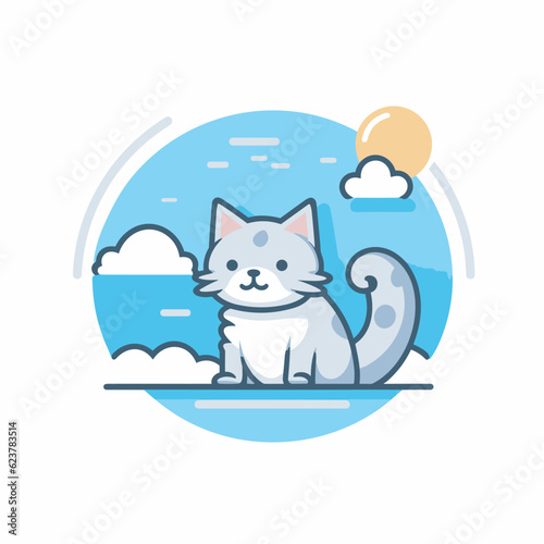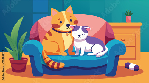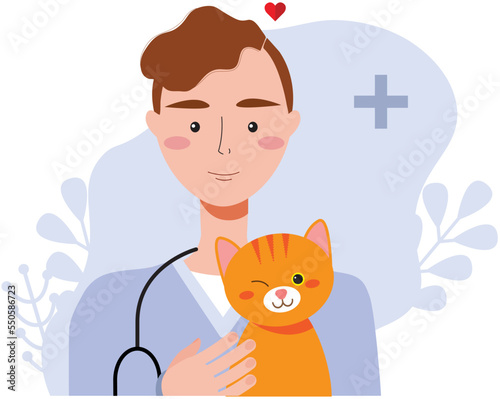 Векторная иллюстрация ветеринарной клиники. Врач в униформе, держащий в руках милого котенка и щенка на заднем плане. Концепция профессиональных услуг по охране здоровья и лечению домашних животных