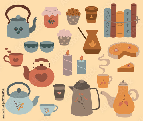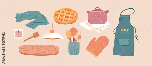 Набор викторианской леди, плоская векторная изолированная иллюстрация. Одежда и аксессуары для английских леди. Корсет, туфли, шляпа, флакон духов, перчатки, набор для шитья, кольцо и шкатулка.